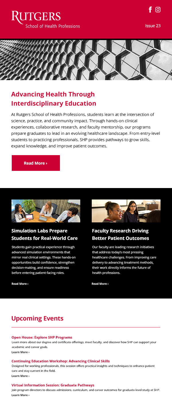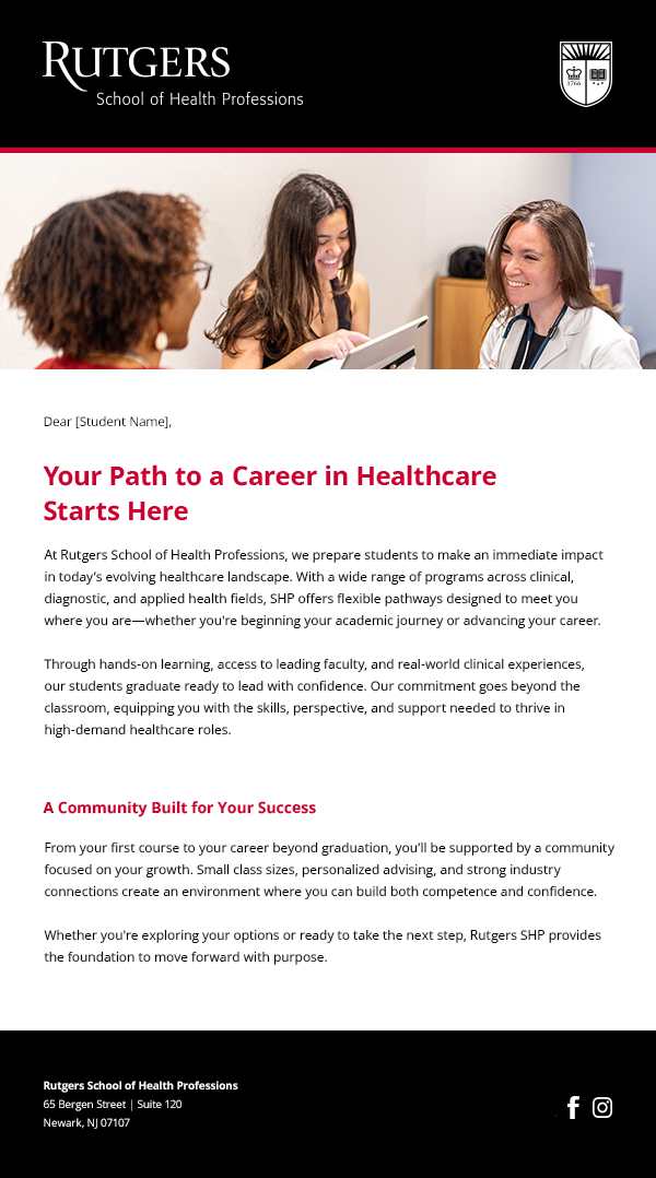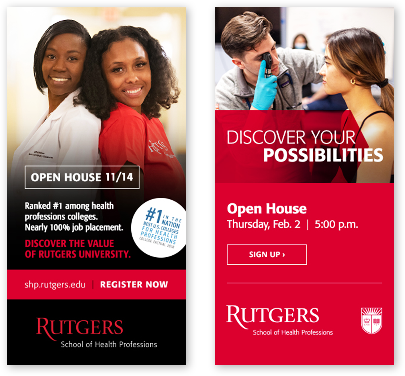 Delivered enrollment creative within Rutgers SHP brand standards for degree recruitment and open house promotion