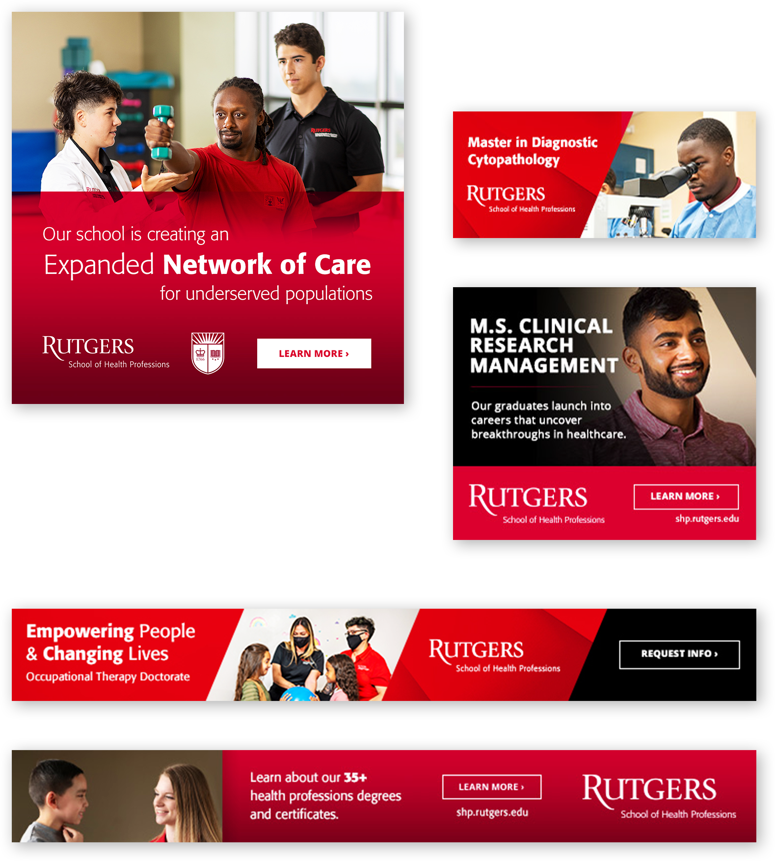 Enrollment Creative and Brand Fidelity followed Rutgers SHP brand standards for color, typography, logo placement, and accessibility. Responsive display and social ads promoted degree and certificate offerings with consistent layouts and clear inquiry information. Open house creative emphasized date, location, and scheduling steps to drive prospective student inquiries. Under the same usage rules, we introduced geometric accents, refreshed imagery, and revised layouts to limit ad fatigue within the existing visual identity. SHP later incorporated several of these ad treatments into its internal brand guidelines.